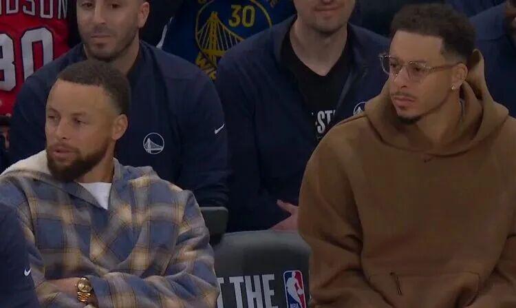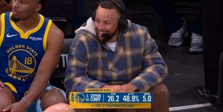 替补席客串解说的库里眉飞色舞,开心得不行